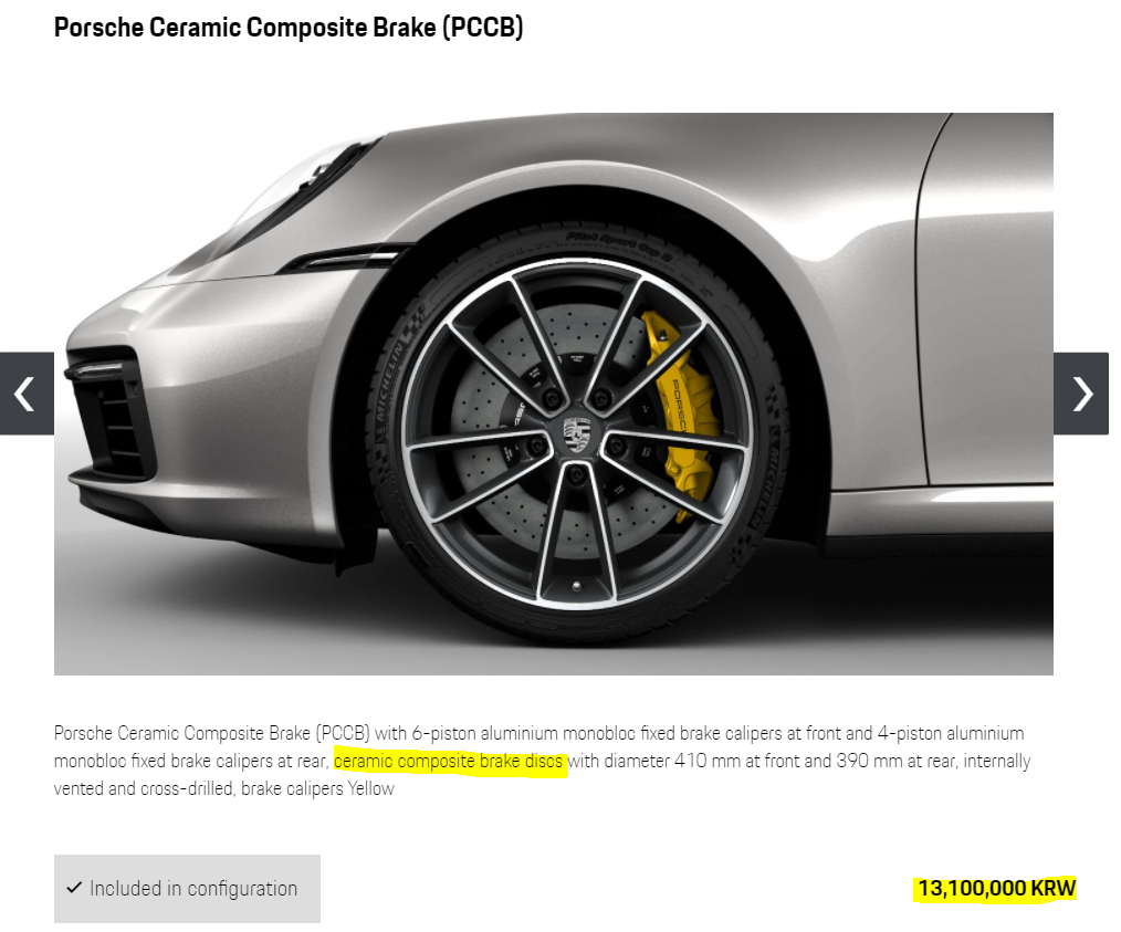 기본 포르쉐 911의 카본 세라믹 브레이크 옵션을 선택하면 1,000만원이 넘는다고 하니 이해가 되시죠?