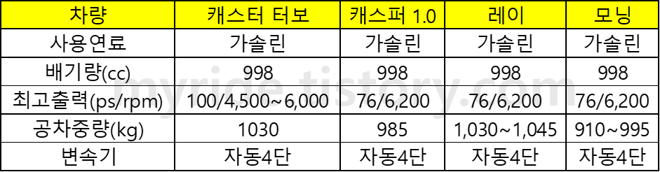 우선 위에서 보여드린 내용과 현재 판매하고 있는 레이와 모닝의 제원을 한 번에 정리해서 비교해보겠습니다.