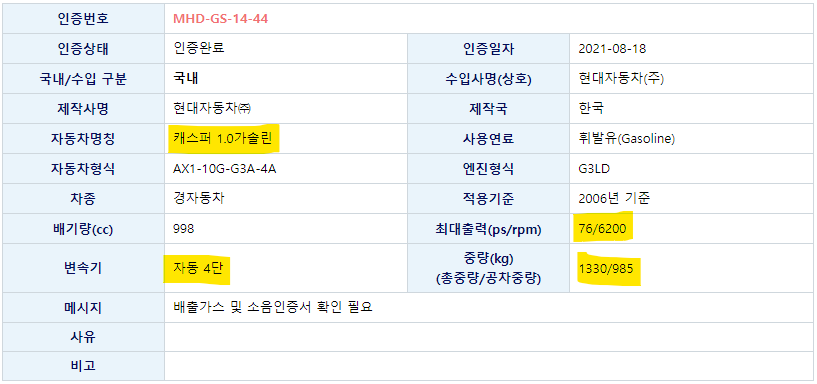 우선 아래의 표는 캐스터 1.0 가솔린에 대한 인증현황입니다. 최대출력 76ps로 레이와 모닝과 동일한 모습이고 변속기는 4단 자동, 공차중량은 985kg입니다. 차량의 엔진형식은 G3LD네요.