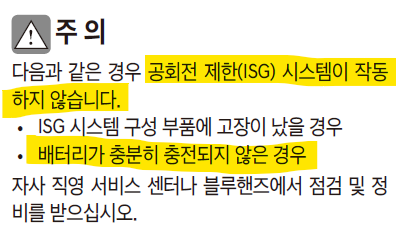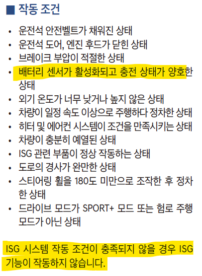 배터리 상태가 충분히 충전되지 않은 경우에는 이 기능이 작동할 수 없기 때문에 서서히 정차 시 시동이 잘 꺼지지 않다가 어느 순간에는 아예 isg 기능이 활성화 되지 않는 상태가 옵니다. 그러면 곧 배터리가 방전될거라는 신호이기도 한 것입니다.