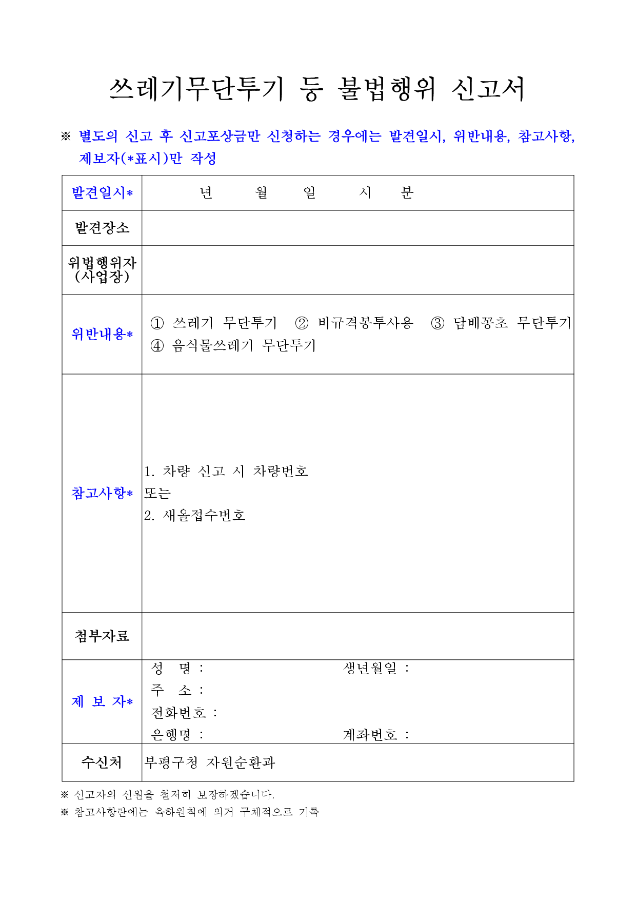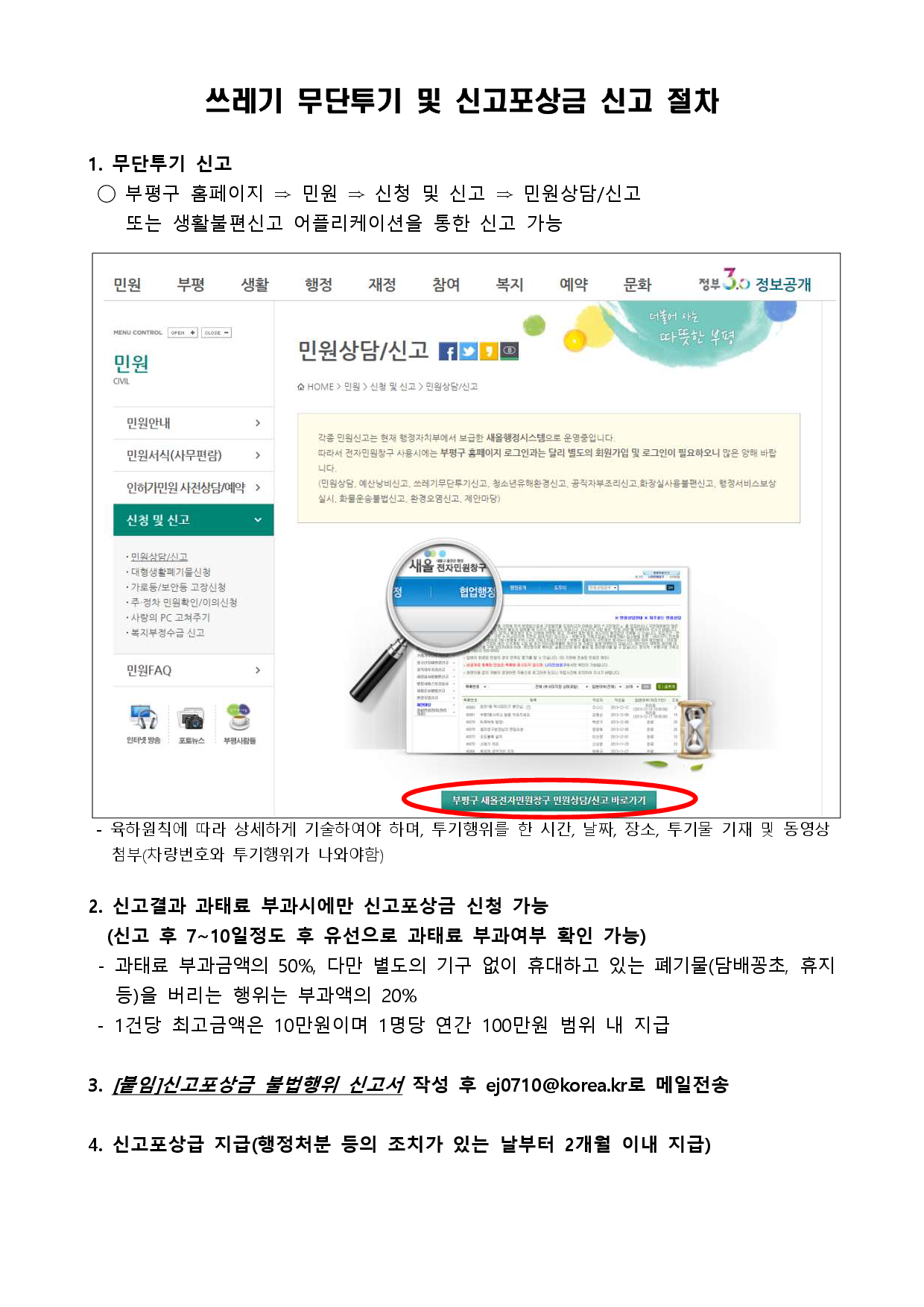 부평소식-쓰레기 불법투기 신고포상금 신청절차 안내 내용 | 인천광역시 부평구청>소통과 참여>