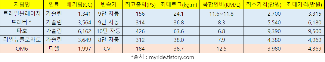 원래는 제조사별로 하나씩 업로드 하고 싶었으나, 르노삼성이 QM6 1종 밖에 내놓지 않았기 때문에 별도로 포스팅하는게 어려워 쉐보레와 하나로 묶어봤습니다.