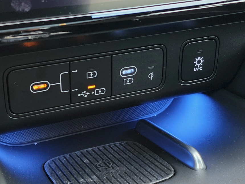 그리고 그 옆에 좀 특이한 버튼이 보입니다. 'UV-C'라고 되어 있는데 직관적으로 뭔가 자외선 소독 기능인 건 알겠는데 어디서 소독을 한다는건지 헷갈리더군요. 처음에는 엠비언트 라이트 때문에 이 버튼 아래에 있는 무선충전 패드를 소독하는건가 싶었는데 그렇지는 않았습니다.