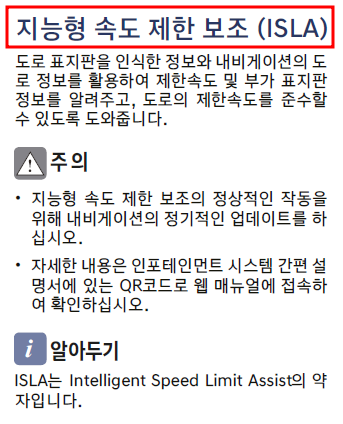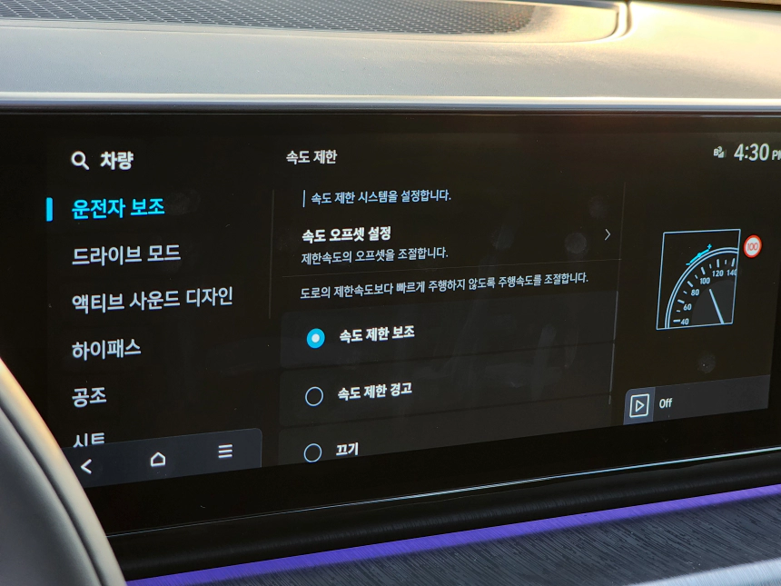 그리고 한 가지 강조하고 싶은 기능이 있는데 바로 '속도 제한 기능'입니다. 뭐 원래 있던거 뭐그리 대단한거냐 싶으실텐데 이 차량에 들어간 것은 단순히 특정한 속도를 한정해버리는 것이 아니라 능동적으로 도로 사정에 맞게 최대 속도를 조절해줄 수 있는 '지능형 속도 제한 보조'가 들어가 있습니다.