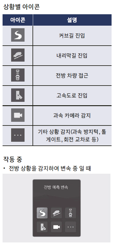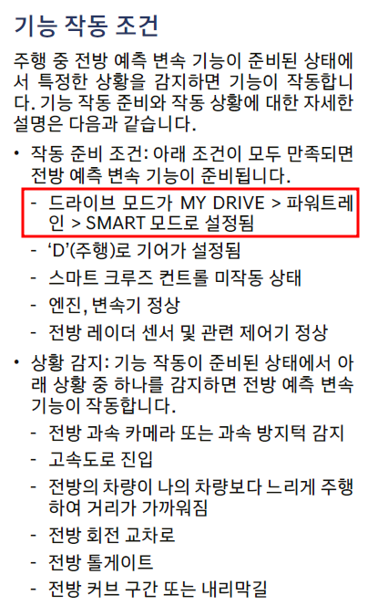 예를 들어 전방에 차량이 있어 속도를 줄일 것으로 예상이 되면 차량이 중립 주행 중이다가 엔진 브레이크를 미리 준비하여 감속에 도움이 되도록 한다거나 반대로 고속도로에 진입할 때 흐름에 맞게 가속을 해야 하는 상황이 앞에 있다면 원활한 가속을 위해서 임시적으로 변속 타이밍을 늦추는 그런 기능입니다. 이건 욕심이 나더군요.