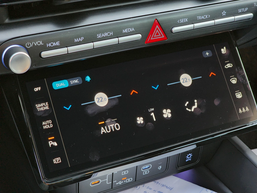 부정적인 시선을 다소 받고 있는 공조기 컨트롤러입니다. 햅틱 반응이 가능한 대형 터치 패드가 들어간 것이 특징인데 누군가는 너무 크다 혹은 택시미터 같다는 의견을 내시더군요. 하지만 저는 시원시원한 것이 마음에 들었습니다. 현대측 설명에 따르면 디자인을 위해서는 조금 더 작은 크기의 패널을 사용할 수 있지만 그랜저 소비자층의 스펙트럼이 상당히 넓고 장년층을 위해서는 이렇게 커야 한다던데 수긍이 가더군요.