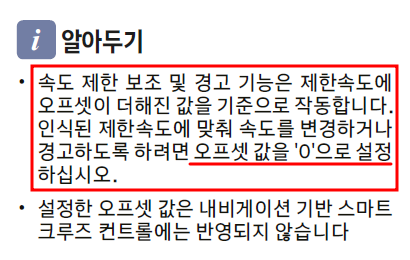제가 시승할 때 제대로 작동을 한해서 충분히 테스트를 해보지 못했는데 이는 설정을 잘못했기 때문입니다. 과속 카메라 앞에서 너무 느리게 가는 것이 싫어 오프셋(OFFSET, 여유분)값을 좀 줬더니 수동 속도 제한이 걸려버린 것이더군요. 도로 사정에 맞게 자동으로 계속 변하게 하려면 오프셋을 0으로 설정해야 한다는 점 참고하시고 추후 시승 차량을 받게 되면 충분하게 테스트를 해보도록 하겠습니다.