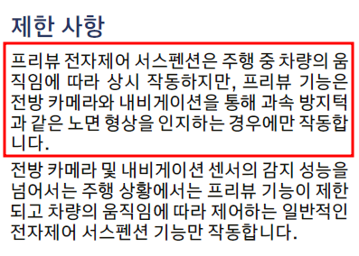 카메라와 내비게이션을 기반으로 서스펜션을 제어해주는 '프리뷰 전자제어 서스펜션'은 아주 큰 기대를 하고 있었지만 취급설명서의 내용과 실제로 테스트를 해봤을 때 극적으로 체감되는 정도는 아니었습니다. 물론 동일한 옵션에서 프리뷰 옵션만 뺀 차량과 비교를 해봐야 정확하겠지만 예상컨데 너무 큰 기대는 하지 않는 것이 좋지 않을까 싶더군요.