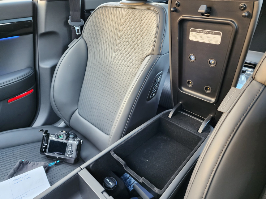 센터콘솔 박스에 카메라를 넣어서 정말로 작동하는지 테스트를 해봤습니다. 뚜껑이 닫히고 작동버튼을 누르니 보라색 조명이 켜지고 뚜껑을 열면 바로 꺼지더군요. 동행했던 엔카매거진 큐피디님의 말씀대로 이런 곳에 쓰던 마스크를 넣어두면 좋겠다 싶더군요.