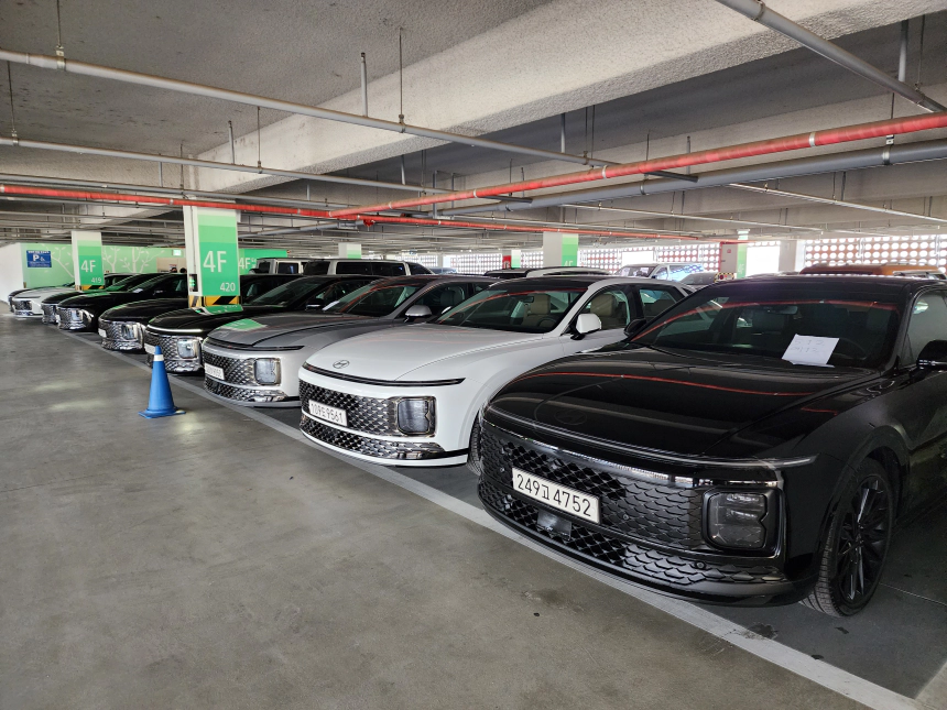 개인적으로 가장 실물이 궁금했고 기대가 되던 '블랙잉크' 차량입니다. 뭔소리냐면 '프리미엄→익스클루시브→캘리그래피'로 올라가는 등급의 최정상에 있는 차량이고 거기에서 블랙을 과감하게 발라버린 조금 특별한 차량이라는 것이죠. 더 쉽게 설명하면 풀옵션에 모든 선택옵션을 다 때려넣은 차량입니다. 이 차량의 가격은 대략 5,490만원 정도 합니다. 4륜에 HUD, 선루프, 2열 리클라이닝까지 모두 들어간 가격이지요.