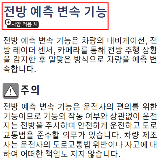 또한 '전방 예측 변속 기능'이라는 것이 있습니다. 내비게이션, 레이더, 카메라 등을 통해 상황에 맞게 미리 변속기 로직을 세팅해서 준비한다는 것이죠. 이게 좋은 기능이냐 하면 이렇습니다.