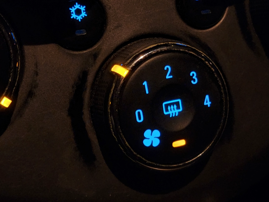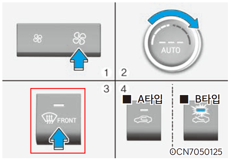 이는 차량의 옵션에 따라 종류가 좀 나뉘는데 대부분 앞유리에 히터의 따뜻한 바람을 불어내는 버튼입니다. 수동 방식의 공조기인 경우 거의 다 시계방향 끝단에 위치하게 되고 오토 에어컨의 경우, 이 버튼을 눌러서 바람 방향을 선택하거나 앞유리에 낀 성에를 제거하기 위하여 바람이 미친듯이 강하게 나오게 될겁니다.