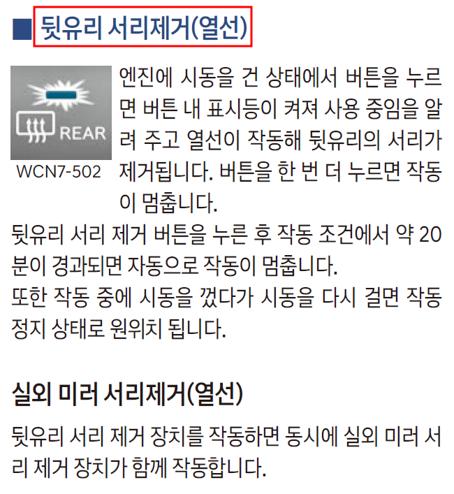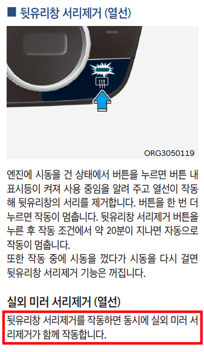 마지막으로 뒷유리 뿐 만 아니라 앞유리 또는 사이드미러 또는 두 곳 모두 열선이 들어가 있는 차량의 경우 뒷유리 열선을 작동시키면 다 한꺼번에 작동한다는 점도 알고 계시면 좋겠네요.