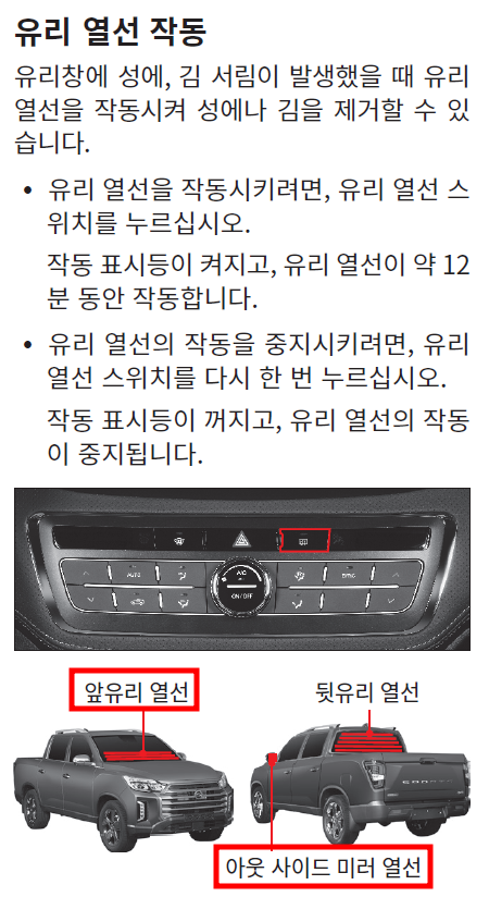 하지만 뒷유리 열선 기능은 없는 차량을 찾는게 더 어렵습니다. 10년도 넘은 경차량에도 들어가고 개방형 적재함 차량인 렉스턴스포츠, 심지어는 포터2에도 들어갑니다... 그러니 이 글을 보시는 분들의 차량에도 있을 겁니다. 없다면 같이 울어 드리겠습니다.