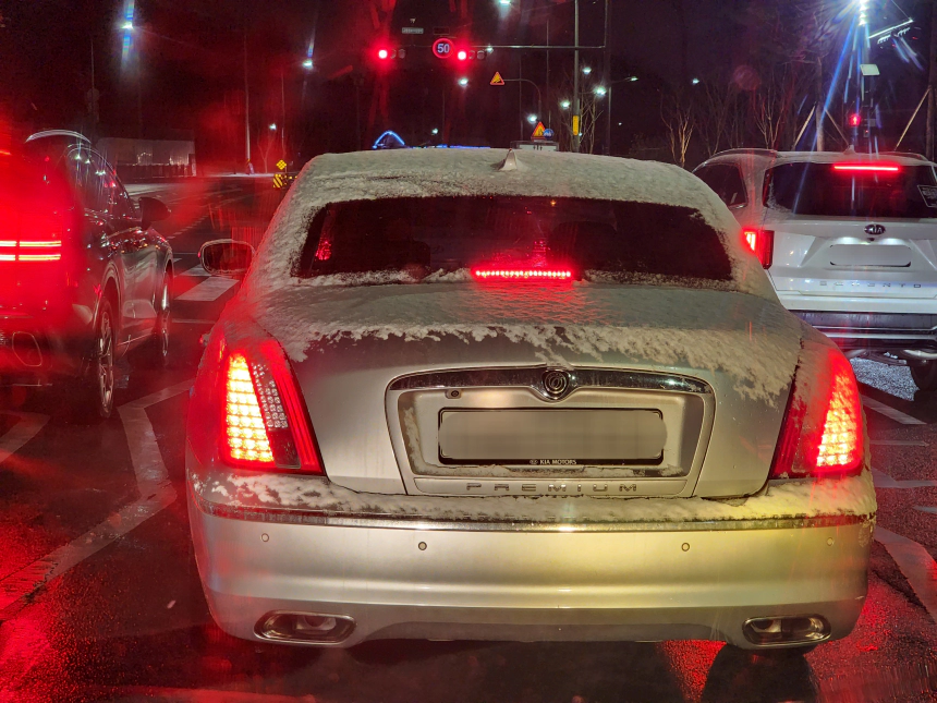 그렇다면 최소 뒷유리 열선이라도 켜고 다니시면 됩니다. 그러면 룸미러로 보는 후방시야가 처음에는 그냥 하얗게만 보이다가 열선이 깔린 모습대로 서서히 녹아내리는 것을 볼 수 있고 충분한 시간이 지나면 아래사진의 등장하는 오피러스와 같이 뒷유리에 쌓인 눈이 없어질겁니다.