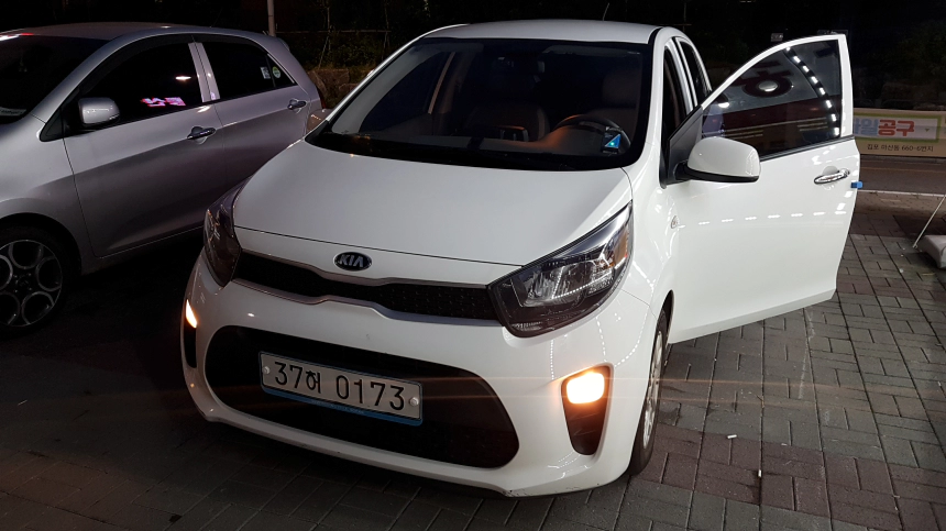 아래와 같이 주간주행등이 켜진 모닝이 있습니다. (LED뿐 만 아니라 벌브형 주간주행등 들어간 차량도 있어요.) 이 차량의 시동이 걸린 상태이고 전조등은 꺼져 있습니다. 이때 뭘하면 주간주행등이 꺼질까요? 네. 맞습니다. 차량으로 들어가 사이드브레이크만 당기면 바로 꺼집니다.