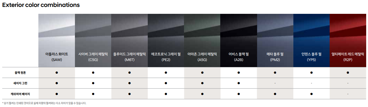 총 9가지 외장 컬러가 준비되어 있습니다. 상당히 다양한 컬러가 준비되어 있는데 기존에 있던 컬러도 있지만 이 차량에 처음 적용된 컬러와 완전히 새로 도입된 컬러도 있으니 참고하시기 바랍니다. 제발 흰색은 사지 마세요..