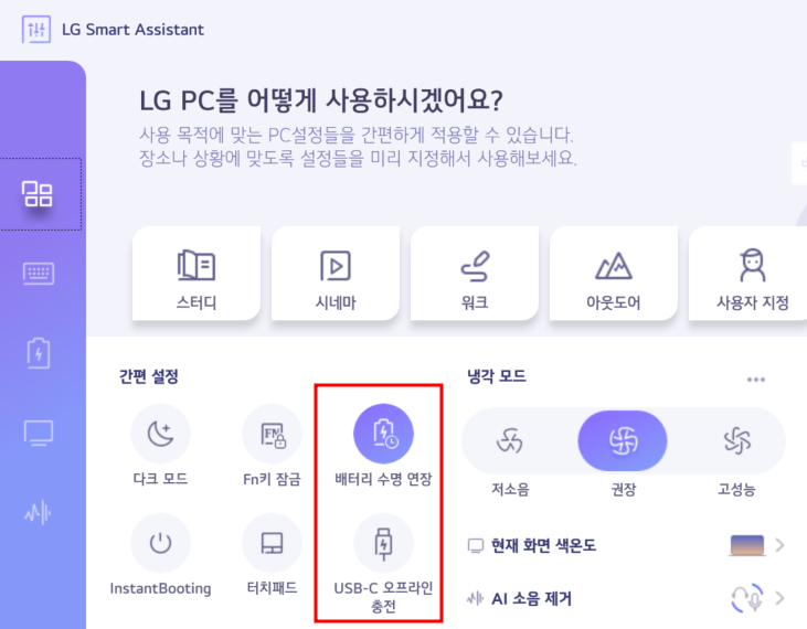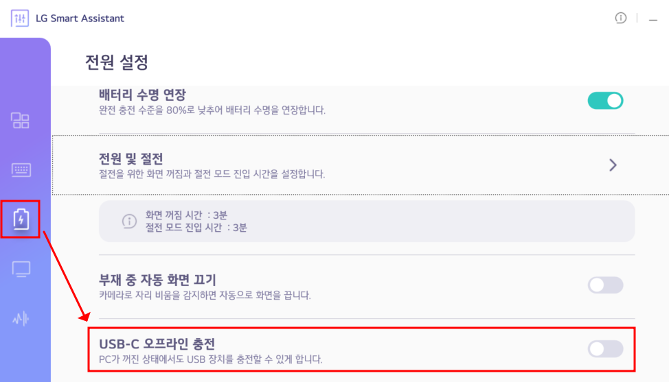 LG 고객센터 AI가 보여준 건 비교적 예전 프로그램이고 최신은 'LG 스마트 어시스턴트'라는 기본적으로 깔려 있는 프로그램을 이용하면 됩니다. 프로그램을 실행시켜 보면 아래와 같이 메인 화면이 나오는데 여기에 'USB-C 오프라인 충전'이라는 아이콘이 꺼져 있다면 문제가 없지만 켜져 있다면 저처럼 방전 문제가 생길 수 있습니다. (아래화면은 꺼진 상태)