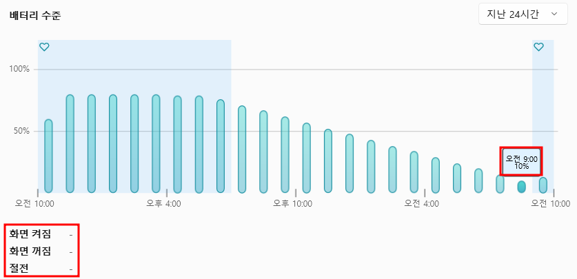 다음날 아침 9시에는 10%로 떨어졌고 화면 켜짐 시간은 여전히 0으로 표시되어 있습니다. 이거 어떻게 된 것일까요?