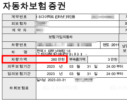아닙니다. 진잡니다. 일단 제가 타고 다니는 차량을 보여드리죠. 여기는 어차피 자동차 블로그이니 자동차에 대한 관심이 많으실테죠? 얼마전에 갱신 가입한 제 차량인 2011년식 아베오 차량입니다. 보통 실제 시세보다 가격이 높은 자차 가액을 보면 260만원이라고 나와 있군요.