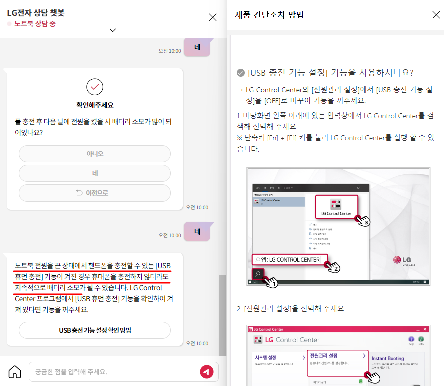 LG전자 고객센터로 들어가서 원인을 물어봤습니다. 이제 상담원에게 바로 연결되는게 아니라 일단 AI를 만나게 되는군요. 일단 한 단계씩 들어가보는데 뭔가가 훅 눈에 들어옵니다.