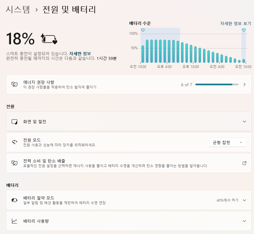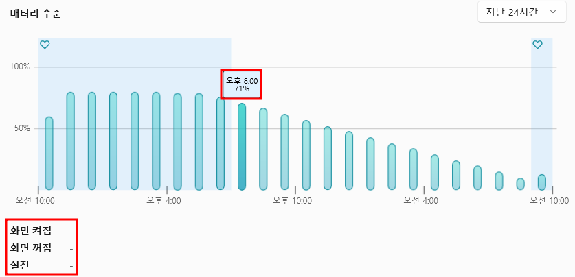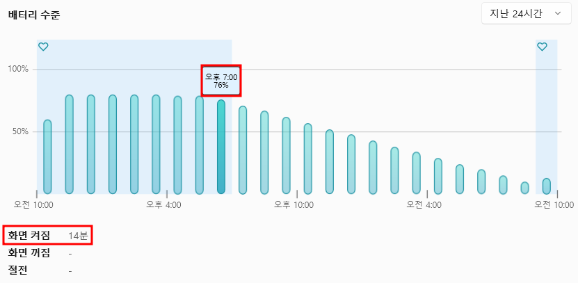 설정을 바꾼 뒤 배터리 수준을 다시 체크해봤습니다. 컴퓨터를 꺼놨더니 이번엔 배터리 소모가 거의 없었네요. 결국 이건 제조사의 문제가 아니라 기능의 의미를 모른 채 그냥 켜놨던 제 문제더군요.