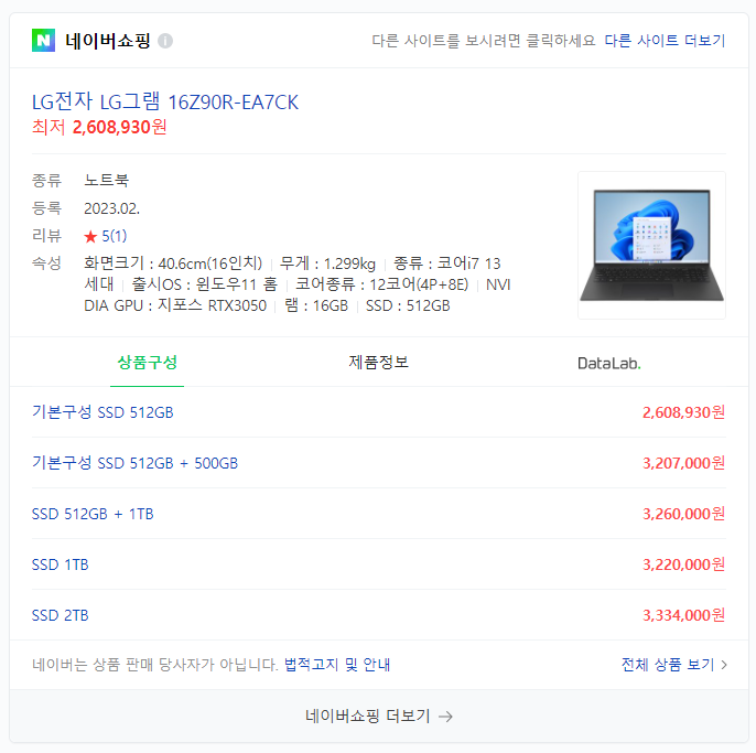얼마 전 회사 대표님이 연락이 와서 장비를 하나 샀으니 알고 있으라고 하시더군요. 휴먼굴림체??ㄷㄷ 기존에는 2017년 9월에 제조된 그램을 쓰고 있었는데 같이 일하면서 프로그램이 열리는 모습을 몇 번 보시더니 결국 하나를 새로 사주셨습니다. 그런데 최저가 보이시나요? 진짜로 제 차보다 비싼 260만8,930원이 최저가 입니다.. 배송비는 별도겠죠?
