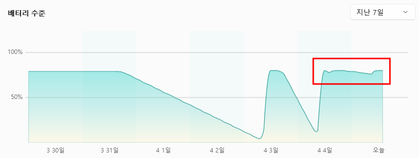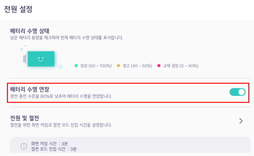 충전을 하지 못하는 상태로 오래 써야하는 환경이 아니라면 이 기능을 켜두면 처음에는 몰라도 몇 년이 지난 상태에서도 배터리가 쌩쌩한 것을 체감할 수 있을거에요.