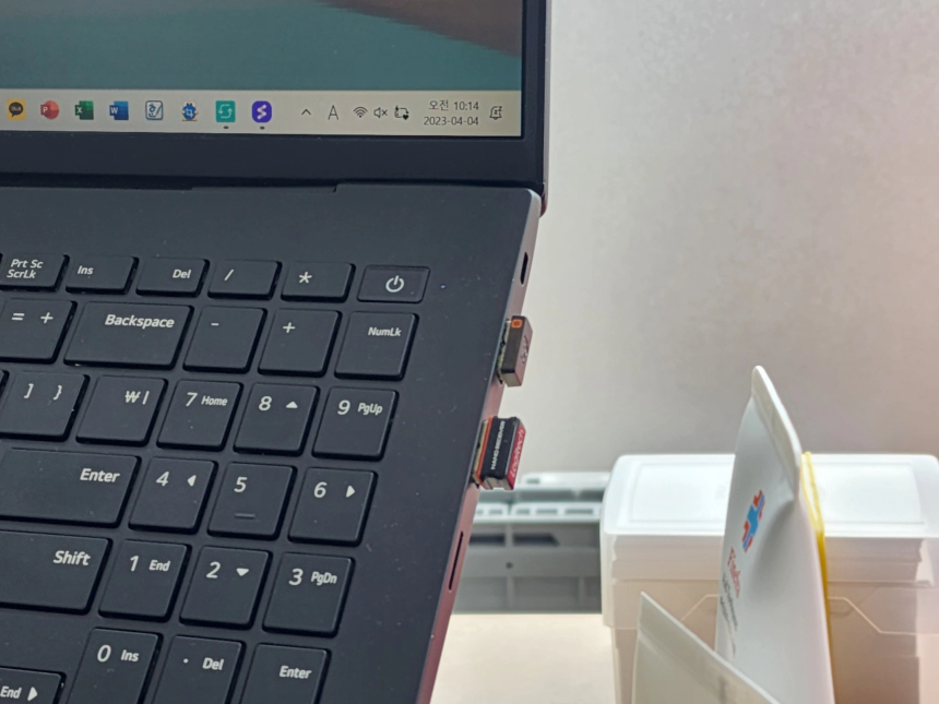 그런데 말입니다. 오프라인 충전 기능을 켜둔 상태에서 제가 따로 노트북의 배터리를 꺼내 쓰지는 않았습니다. 그냥 무선 마우스와 키보드를 위한 USB 리시버만 2개 꽂아둔 것이었죠.