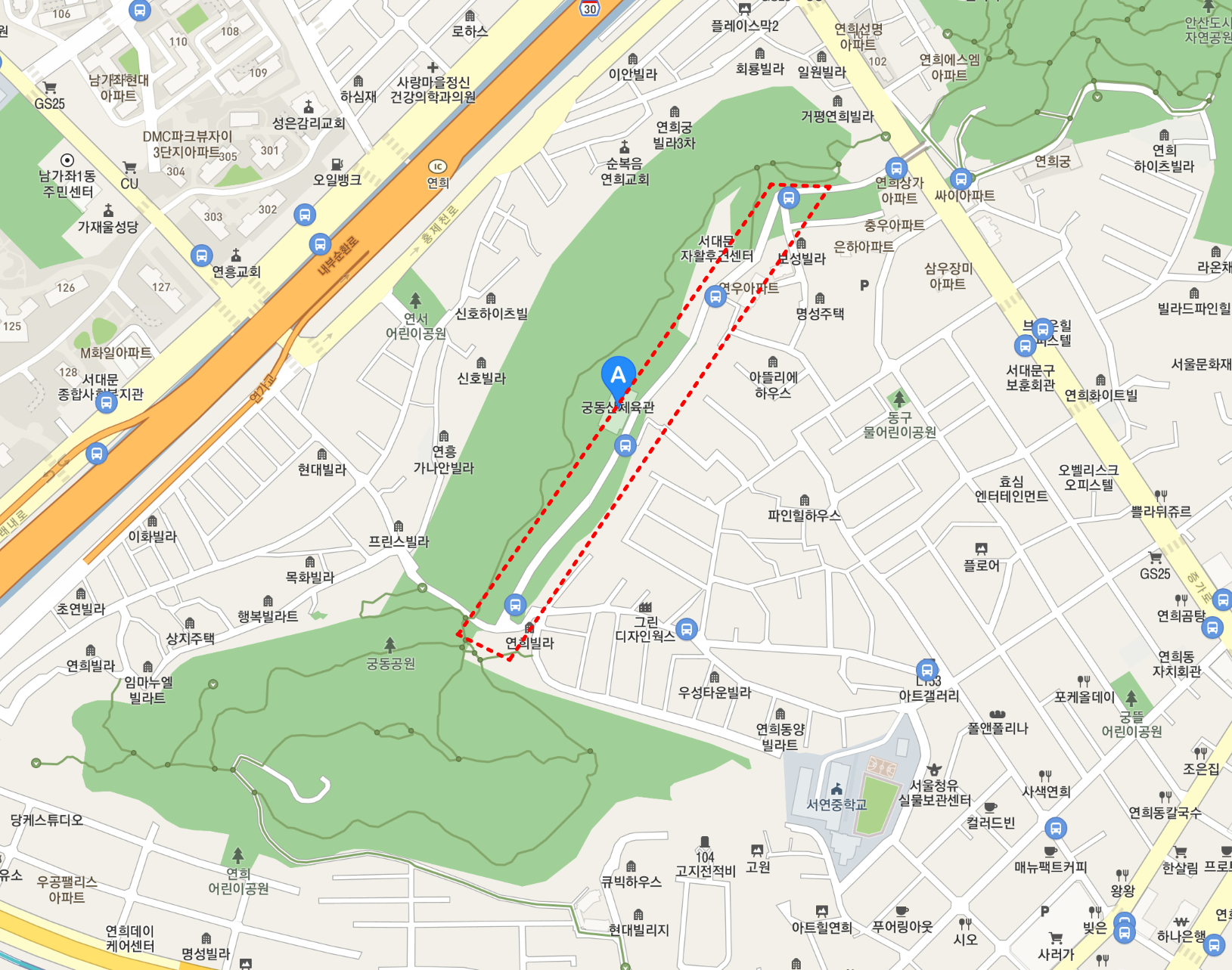 일단 내비게이션에 '궁동산체육관'을 치고 가시면 됩니다. 네, 연희동도 좀 넓으니 다를 수 있겠지만 제가 있던 궁동공원 동남쪽은 웃돈을 주더라도 가능한 유료 주차장 자체도 없습니다. 그래서 겨우 찾은 곳이 바로 궁동산체육관입니다.