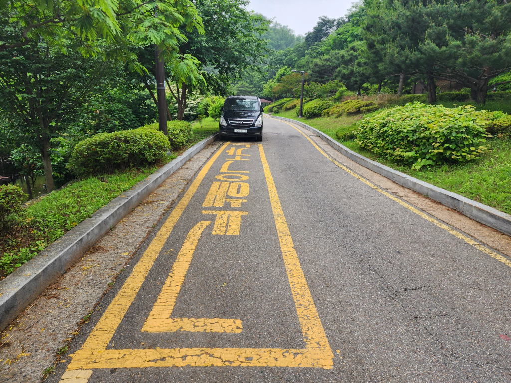 앞서 말씀드린대로 이곳은 양방향 통행이 가능한 곳이기 때문에 자주 있는 일은 아니지만 분명히 반대 방향에서 오는 차량과 마주치는 경우가 있습니다. 그렇기 때문에 중간 중간에 이렇게 교행구간 표시가 있고 이 곳에 주차를 하게 되면 여지없이 불법주차에 단속되게 됩니다.