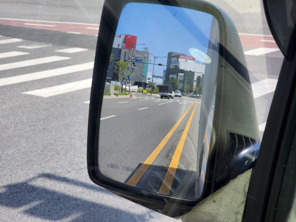 따라서 사이드미러를 통해 다른 차로도 살펴야 하고 차량의 뒤와 가까운 아랫부분도 살펴야 하고 캡보다 살짝이나마 돌출된 탑차량의 옆면을 확인하기 위해 멀리까지 볼 수 있어야 합니다. 따라서 이런 복잡한 환경을 한 번에 볼 수 있다는 점이 상당히 마음에 들더군요.
