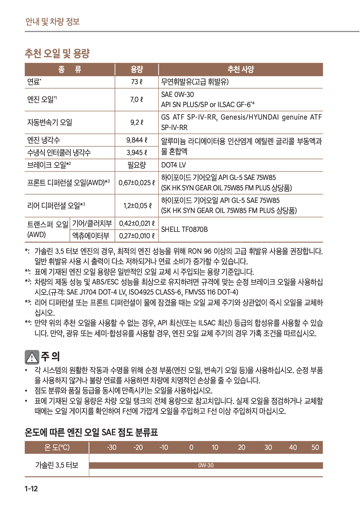 그건 아닙니다. 비교 확인을 위해서 먼저 2022년식 3.5 가솔린 터보 모델의 취급설명서를 보여 드리면 엔진오일 용량 7.0리터, 규격 API SN PLUS/SP or ILSAC GF-6, SAE 0W-30이라는 기준과 동일하더군요. 그래도 '2023년형 슈퍼차저가 들어간 G90의 정보를 찾아오신 분'을 위해서 별도로 정리를 하도록 하겠습니다.