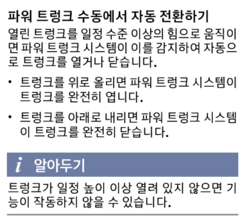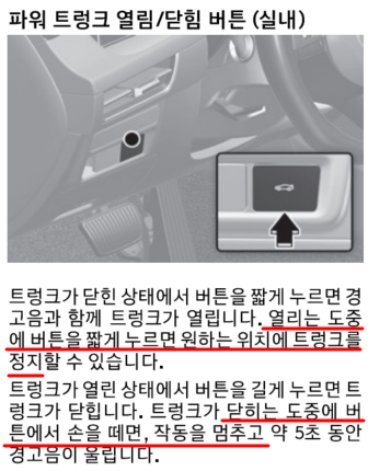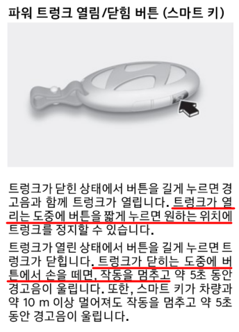 그러니 파워트렁크가 열리기 시작했는데 멈추고 싶으면 다시 버튼을 한 번 클릭하면 열리다가 버튼을 누른 순간 멈추게 되고 닫을 때는 버튼에서 손을 떼는 순간 멈추고 경보음을 알려주게 됩니다. 이제 이해 되셨죠?