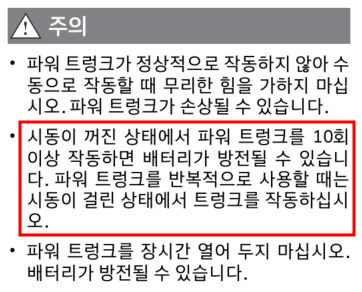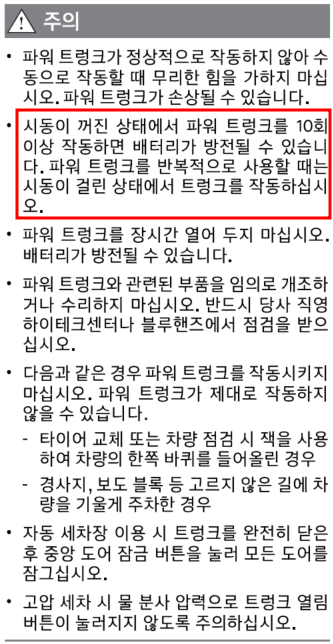 그래서 취급설명서에 보면 '시동이 꺼진 상태로 파워 트렁크를 10회 이상 작동하면 배터리 방전될 수 있다'고 안내하고 있습니다. 용자라면 테스트를 해보셔도 무방하겠지만 말리고 싶군요.