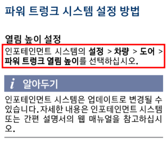 전동트렁크는 열리는 정도를 설정할 수 있습니다. 인포테인먼트 시스템에서 설정▶차량▶도어▶파워트렁크 열림 높이 에서 설정을 할 수 있으니 원하는 수준으로 설정하시면 됩니다.