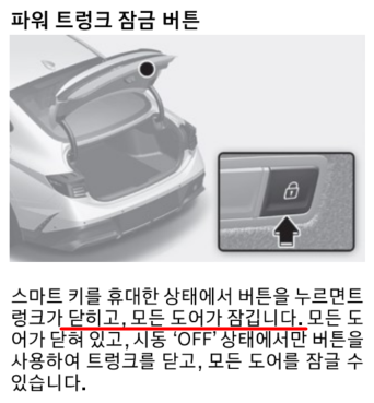 일단 개폐 버튼은 단순히 트렁크만 열고 닫는 기능을 하고 좌물쇠 버튼은 스마트키를 소지한 상태에서 주행을 다 마쳤으니 트렁크에서 짐만 꺼내서 집에 갈 때 이 버튼을 누르면 트렁크가 닫히면서 모든 차량의 도어도 함께 닫는 기능을 합니다.