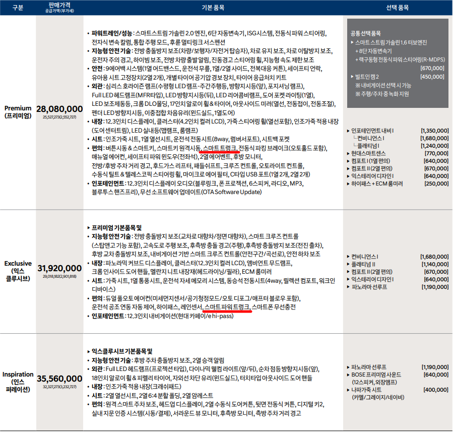 일반 가솔린 모델을 기준으로 보면 트림은 프리미엄▶익스클루시브▶인스퍼레이션 이렇게 3단계로 구성이 되는데 기본 트림인 프리미엄에서는 모든 옵션을 다 때려 넣어도 전동트렁크를 가질 수가 없고 약 3,200만원에 달하는 익스클루시브 등급을 선택해야만 '스마트파워트렁크'라는 이름의 전동트렁크가 들어갑니다.