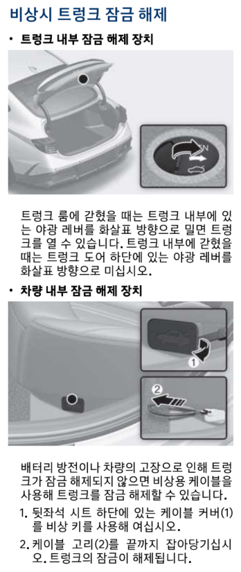 일단 납치를 당하셨으면 먼저 112에 신고를 하세요. 그게 아니고 탈출만 하면 되는 상황이라면 트렁크 안쪽에서 잘 찾아보면 수동으로 여는 버튼이 보이실겁니다. 야광 스티커까지 있기 때문에 스마트폰으로 몇 번 뒤적거리면 밝게 빛날테니 잘 찾아보시면 됩니다.