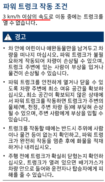 이런 괴짜같은 질문을 하실 수 있는데 일단 '가능은 합니다'. 그런데 취급 설명서에 보면 3km/h 이상 속도에서는 트렁크를 열 수 없다고 하니 정지 상태에서 열어두고 달리거나 브레이크에서만 발의 힘을 살짝 빼는 정도의 속도에서는 작동 가능하지만 달리는 도중에 트렁크를 열 수는 없는 것이죠.