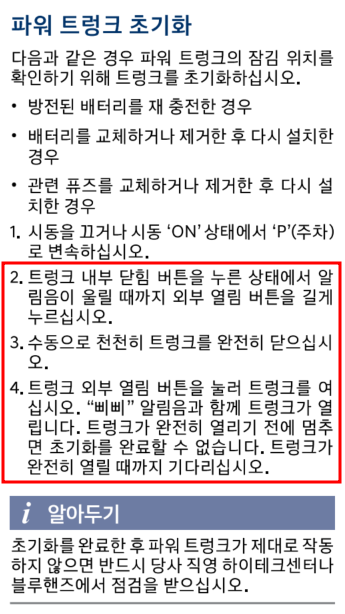 리셋하는 방법은 일단 시동을 끄거나 ON 상태에서 트렁크 내부의 닫힘 버튼을 먼저 누른 상태에서 외부에서 누르는 버튼을 누르고 기다린 뒤 손으로 끝까지 눌러 닫으면 됩니다. 이 상태에서 외부 열림 버튼을 눌러 열면 '삐삐' 거리는 소음과 함께 트렁크가 열리는데 중간에 멈추면 안됩니다. 조금 기다리셔야 합니다.