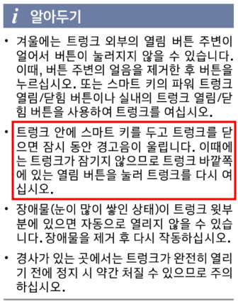 특징은 트렁크 안에 스마트키가 있는 상태에서 외부에서 버튼을 누른다면 차량에서 경고음을 내면서 트렁크를 닫지를 않으니 혹시나 실수로 가방 등에 다른 키를 넣고 문을 닫으려 한 건 아닌지 먼저 확인을 한 다음에 고장을 의심하는 것이 바람직합니다.