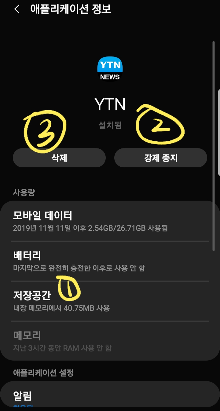 "데이터 삭제" + "강제 중지"를 꼭 기억하세요.